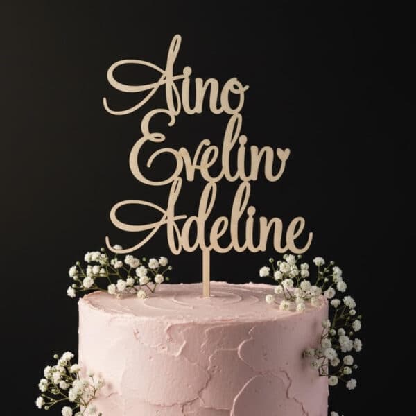Yksi nimi per rivi on suositeltu vaihtoehto. Mikäli jollain rivillä on yli 8 kirjainta niin suosittelemme vähintään kokoa 2 , ettei koriste jää liian pieneksi. Mikäli tilaat useampia kakkukoristeita ja toivot koristeiden olevan keskenään esimerkiksi samaa fonttikokoa niin, mainitse tästä kohdassa ”muuta mainittavaa”. Pidätämme oikeuden tehdä koristeesta hieman isomman, mikäli tuotteen kestävyys sitä vaatii.