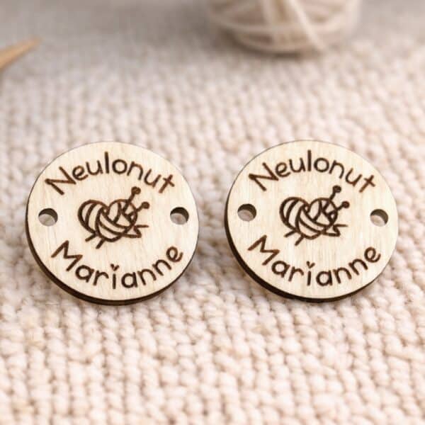 Kiva merkitä neulomansa tuotteet yksilöidyillä ”napeilla” /merkeillä. Siististi kaiverrettu.