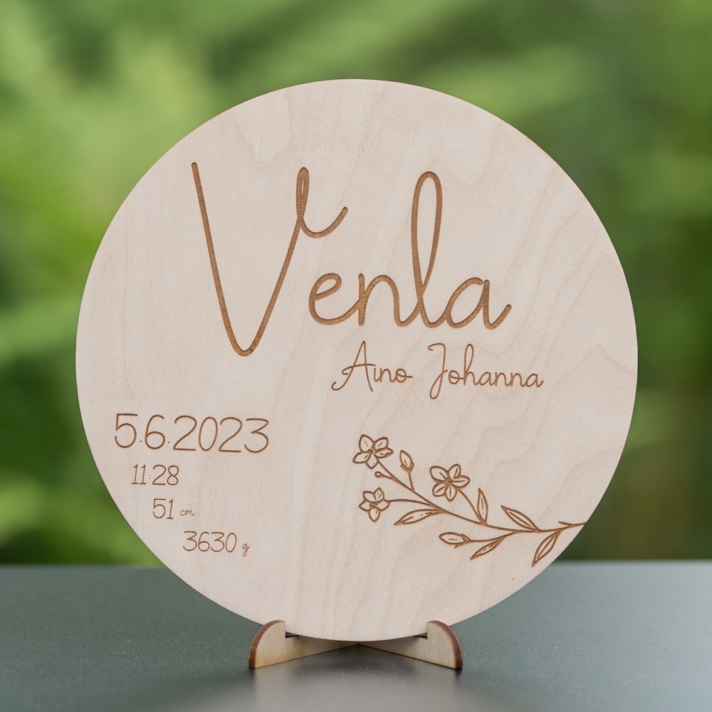 Puinen syntymätaulu lapsen tiedoilla. Voidaan laittaa tauluksi seinälle tai asettaa pöydälle mukana tulevalla jalalla. Taulun halkaisija on 18 cm.